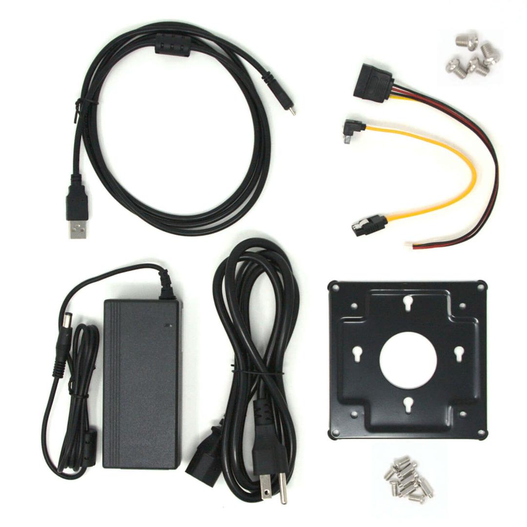 Include sursă de alimentare 12V, kit de montare VESA, cablu pentru consolă serială, cabluri SATA de date și alimentare pentru SSD intern, ghid de pornire rapidă