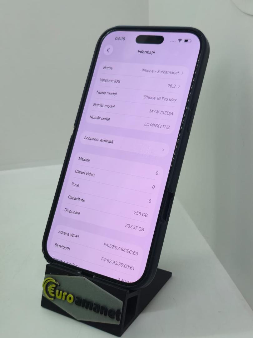 Telefon mobil Apple iPhone 16 Pro Max, 256GB, 5G, Black Titanium